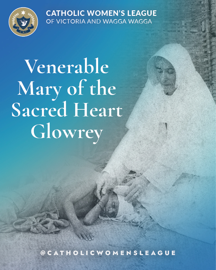 The Apostolate of the Mary Glowrey Prayer Group is a prayer circle that keeps women and their families closely connected in the solidarity of prayer and spiritual inspiration whether these ladies are active or home bound, in urban or regional areas. It was originally set up so that older members who were unable to actively assist the League could still join in its mission. Now it is open to all members and is under the patronage of our first President and doctor missionary Venerable Mary of the Sacred Heart Glowrey. We cannot gauge how much our existence relies on these prayers!